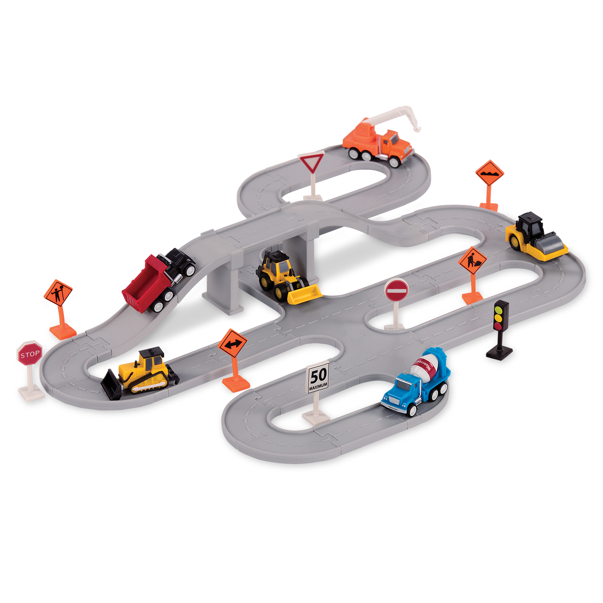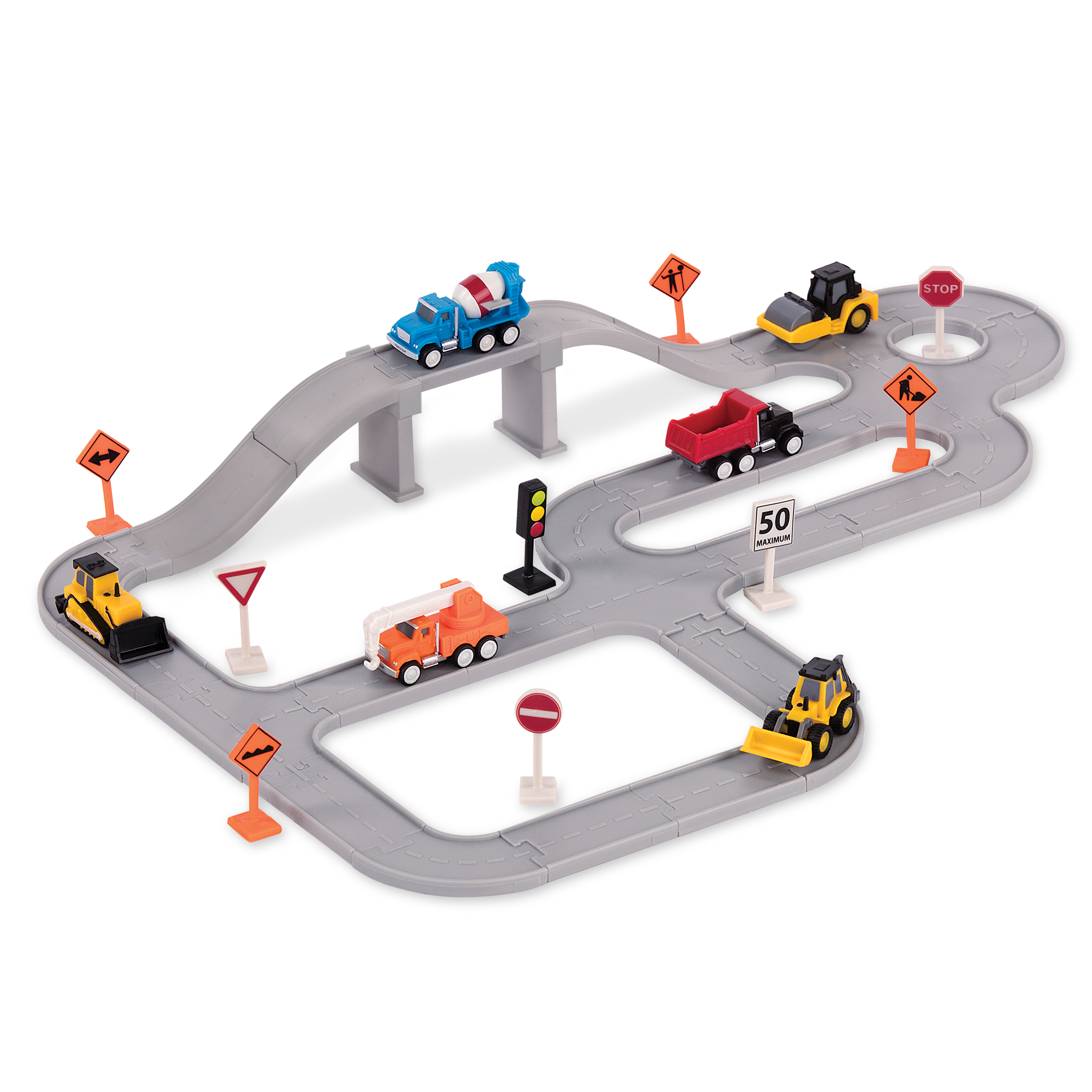 - 57-Piece Set: Includes 6 Pocket Series construction vehicles, 9 road signs, and 42 easy-to-connect tracks.