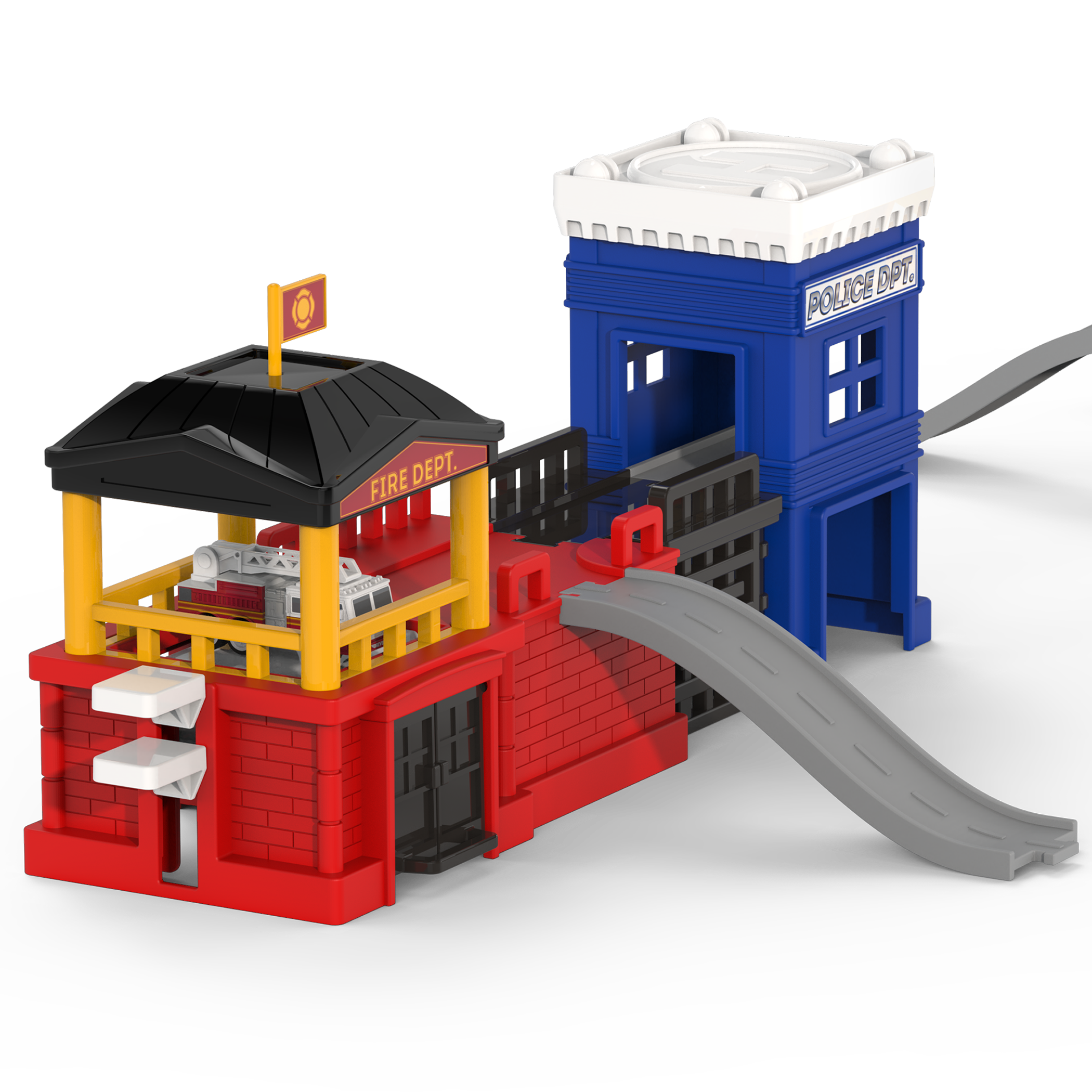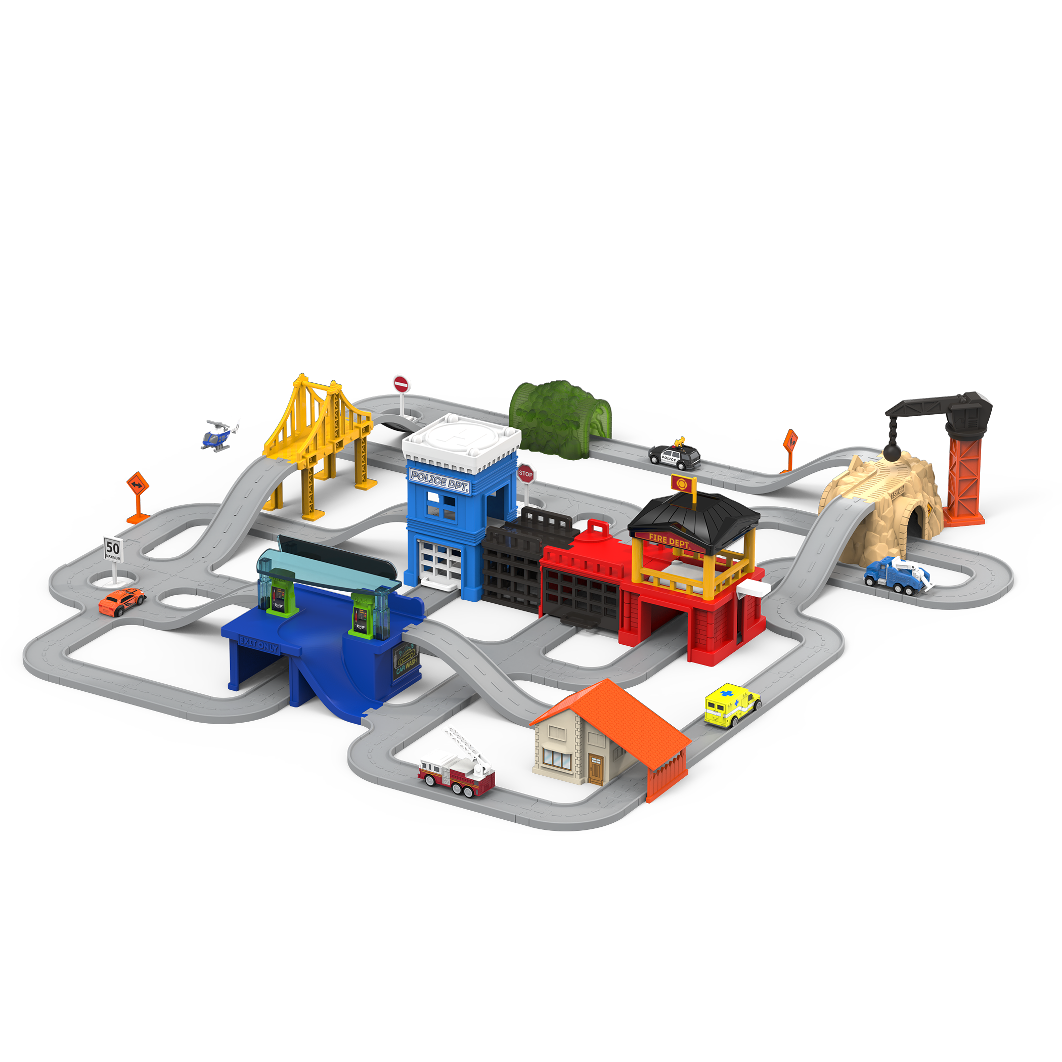 • 129-piece Set: Includes 6 toy vehicles, 102 track pieces, a police station, a construction crane, a bridge, and so much more.