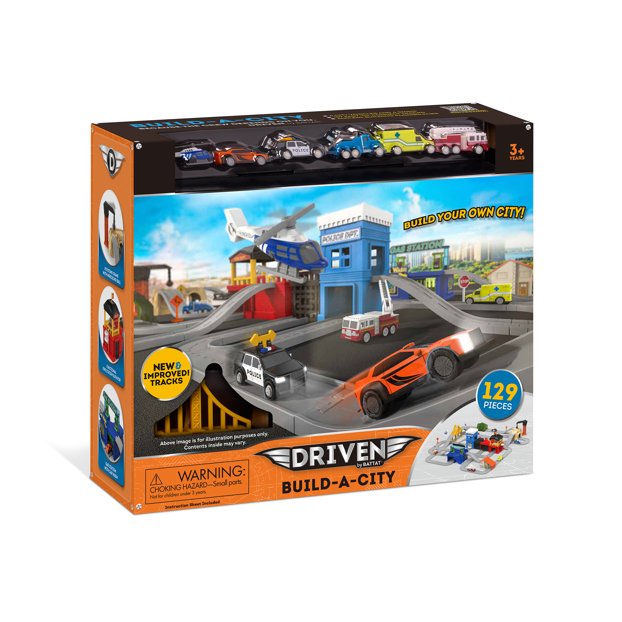 Imagine and creat your own customizable mini world with the Pocket Build-A-City Playset from DRIVEN by Battat! This set is packed with fun features and new sturdy tracks for easy assembly. The playset includes miniature road signs, tunnels, bridges, to make the city look and feel like the real thing! This playset also comes with a variety of vehicles, includin a car, fire trucks, police SUV, helicopter and many more. Drive them around and explore your new city– visit the fire station, gas station, police station and many more city-themed locations. Everything you need to put together to build your dream city is here! Stay DRIVEN, because the crew depends on you.