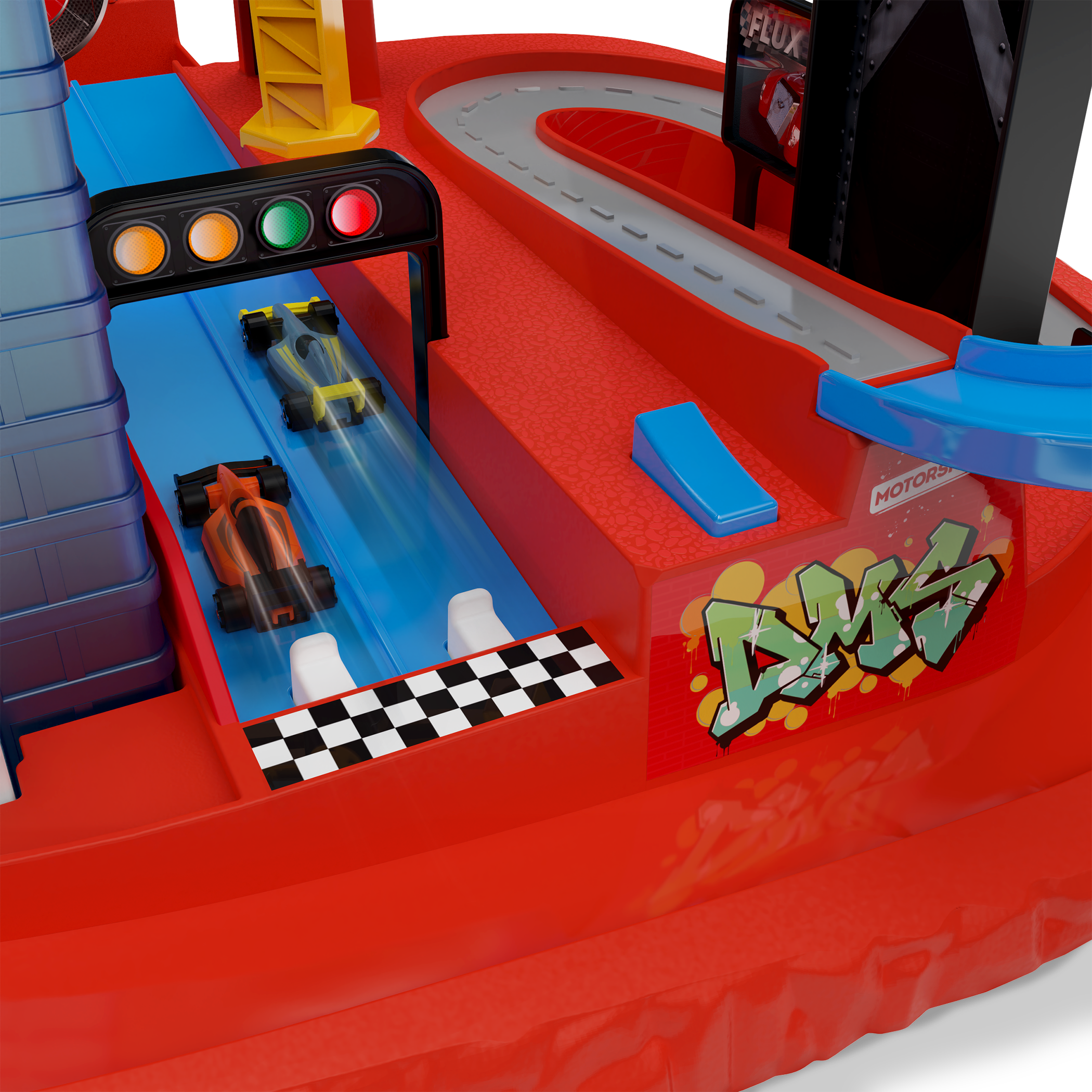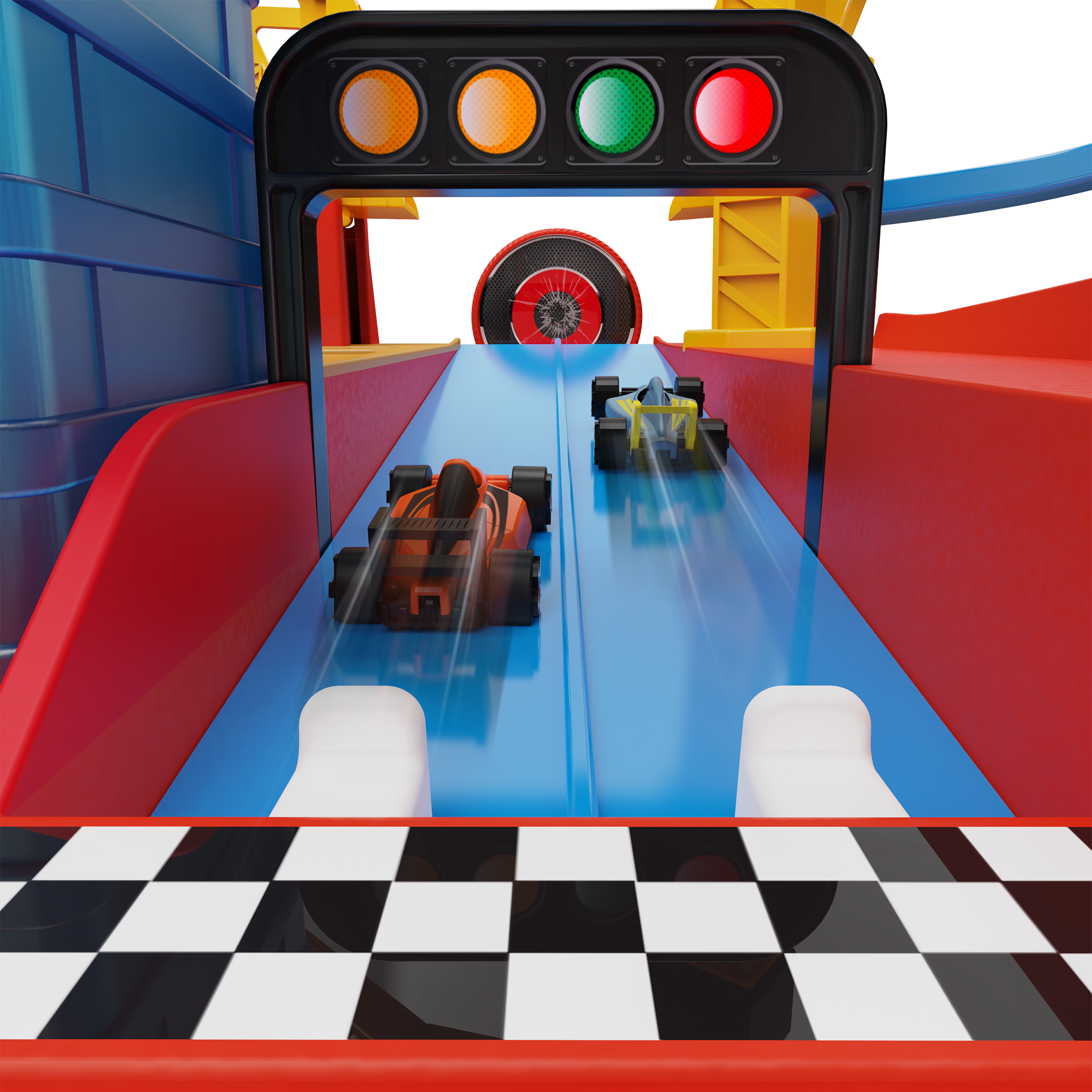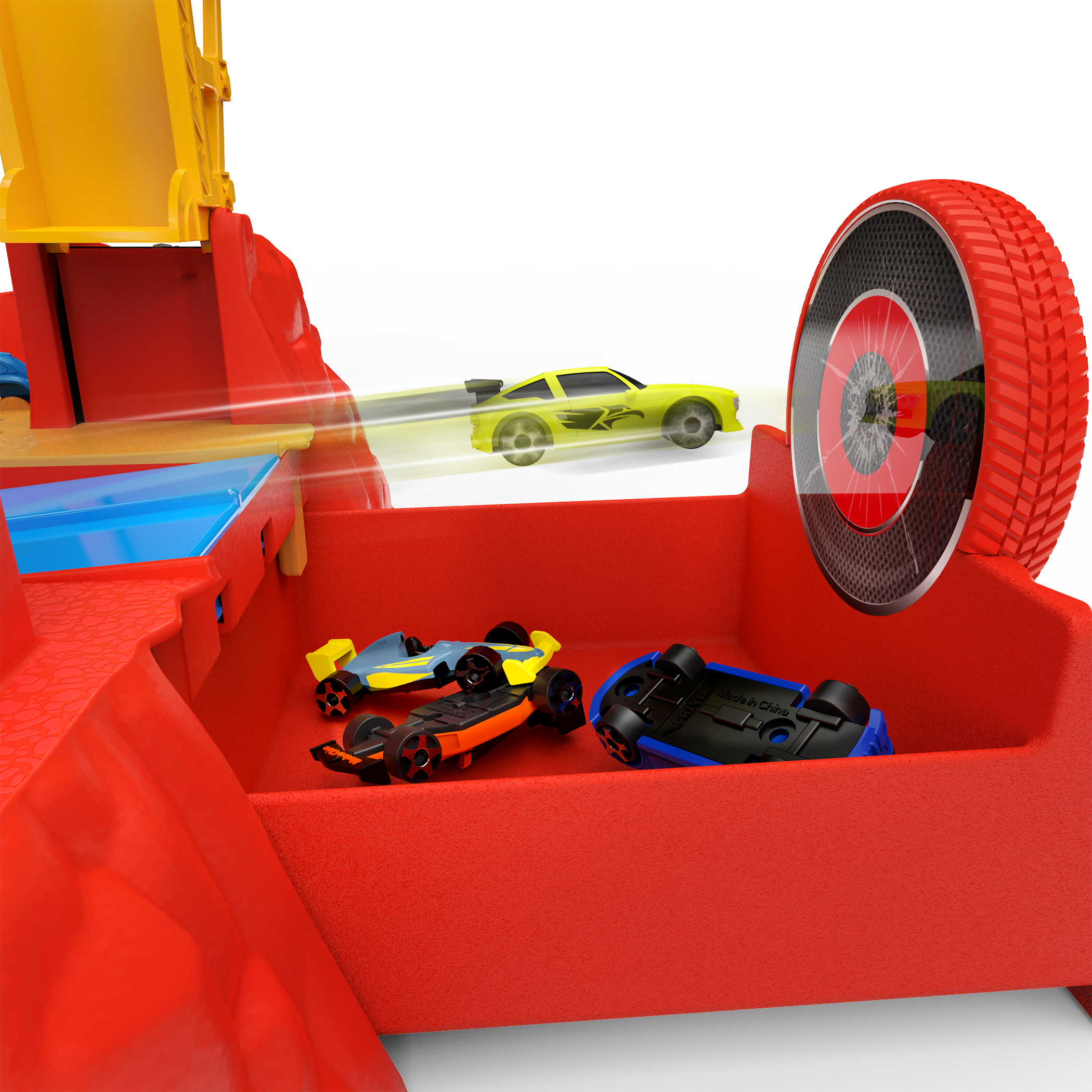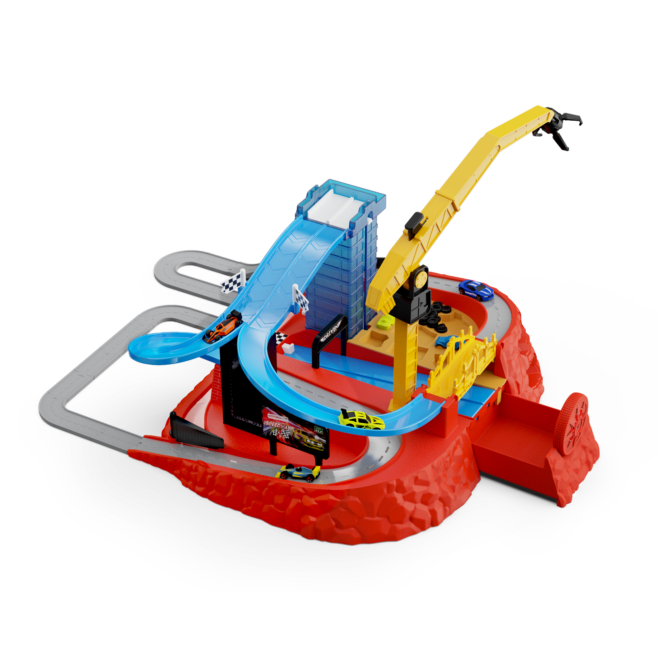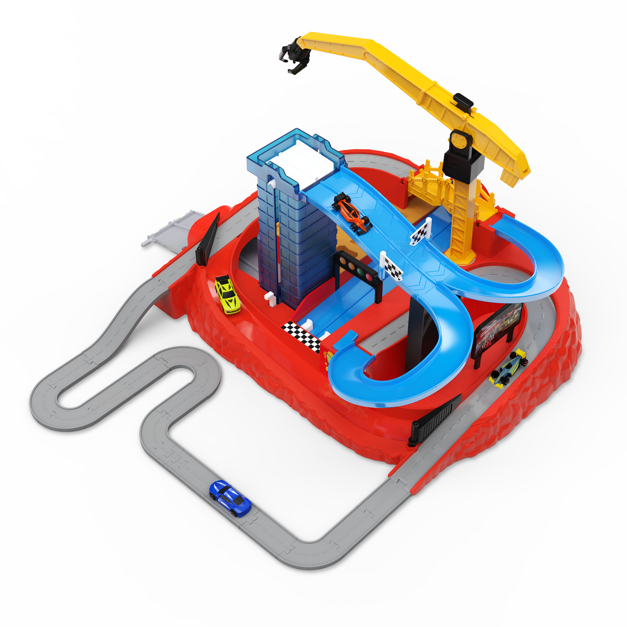 - Movable Parts: Load and lift the elevator, launch cars from the dual launcher to hit the bullseye, snatch rivals with the claw crane, and stash racers in the built-in storage wall.