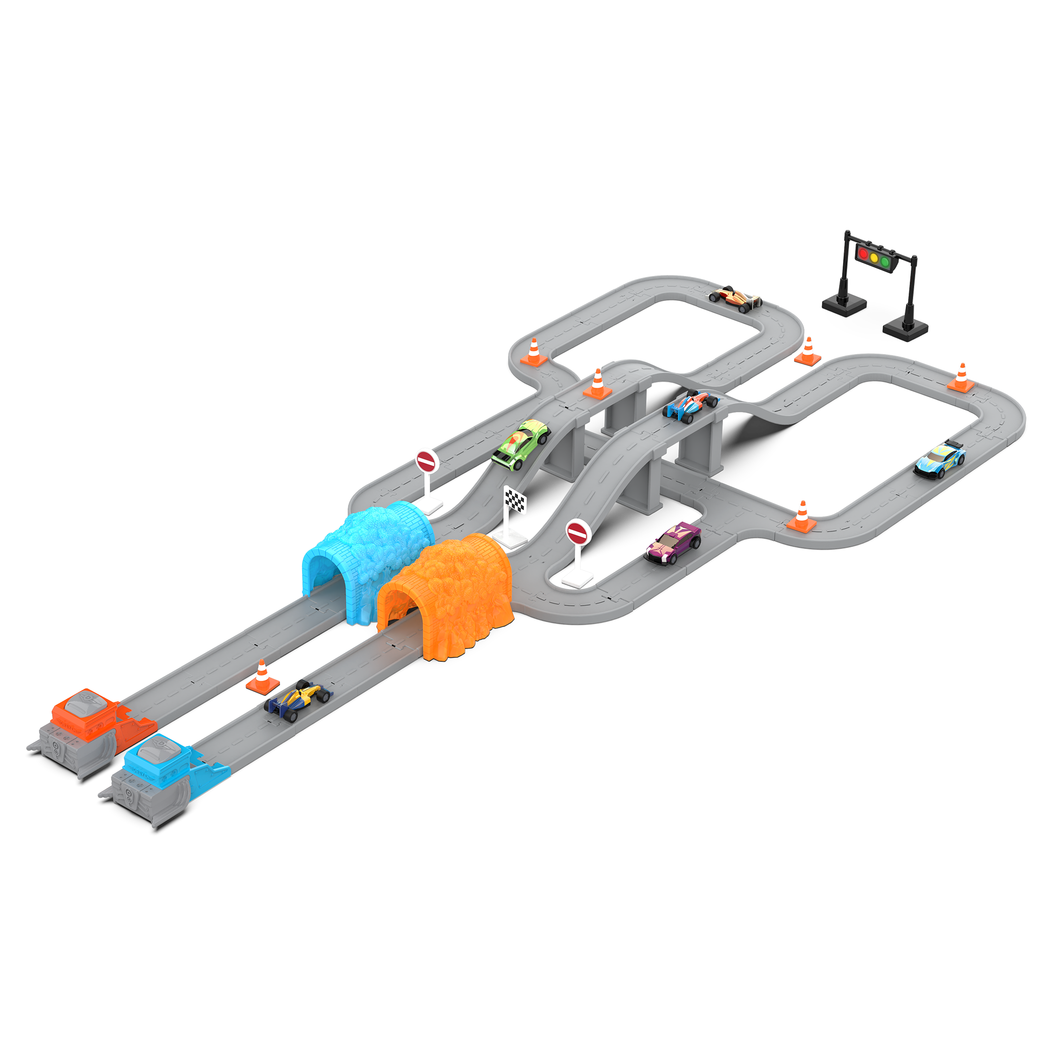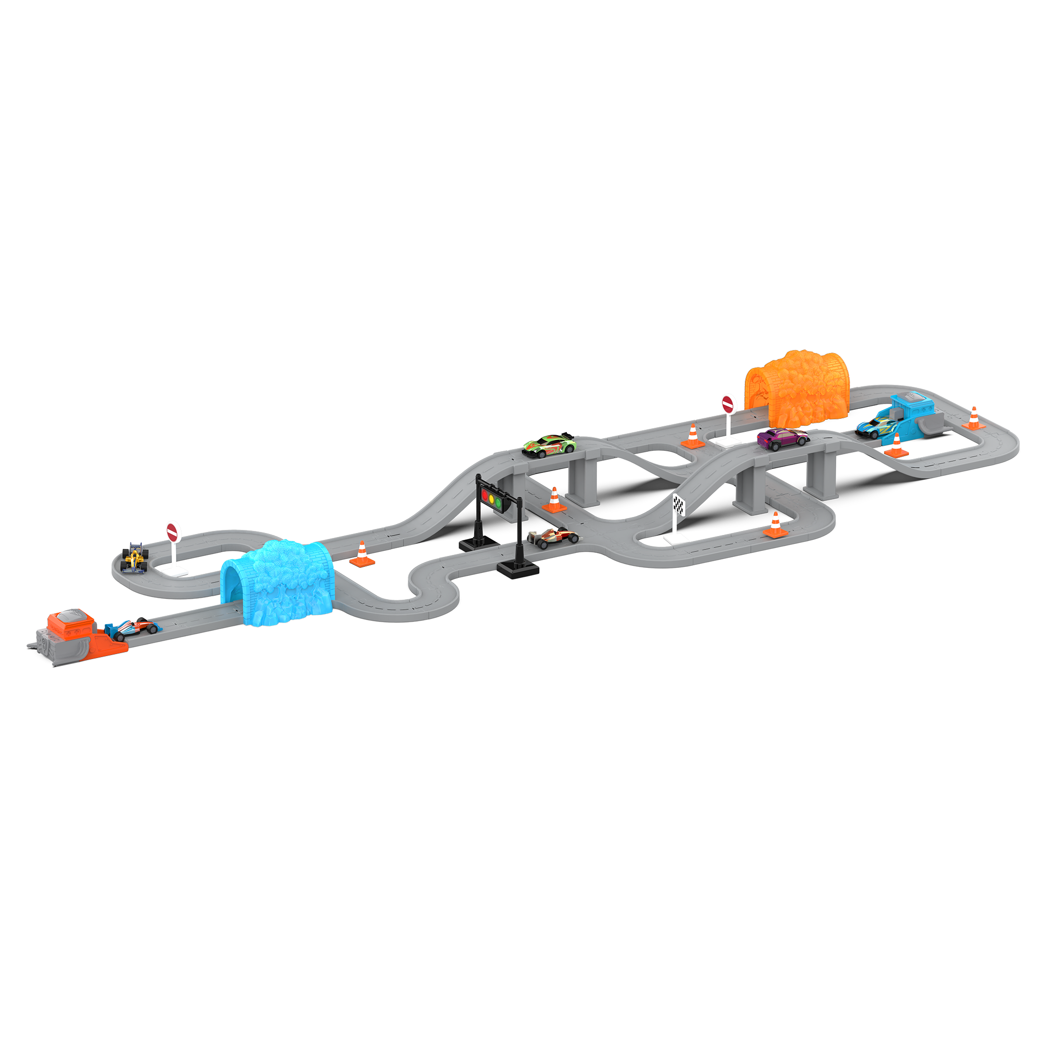 - 84-Piece Set: 63 interlocking track pieces, 2 launcher track pieces, 6 street signs, 5 construction cones, 2 tunnels, and 6 sports cars.